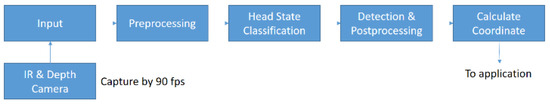 The flow chart and the visualization of the method in this study are shown in Figure 1 and Figure 2. The output three-dimensional coordinate of the sample images was (1.43514, 4.08796, 58.1) cm. The method was developed to achieve high execution speed by shrinking the image in the preprocessing step. The rotation of the face or the mask was used for the detection of the eyes. The head-state classification was also used to check if the face was rotated correctly (the orientation of the head) or if the mask was worn. Finally, we determined the position of the eyes on the shrunken image after detection and postprocessing. The midpoint of elements of the pair was transformed on the coordinate set by a camera.