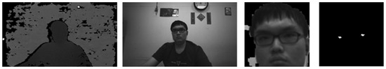 In the method, two input images were captured at a speed of 90 frames per second. The pixels of the depth image were 0–65,535 (16 bits). The gray-scale infrared image had a range of 0–255. When two objects were captured in the same resolution at the same time, their positions and sizes were also identical. Therefore, if the midpoint of the eyeballs is at (r, c) on the image, the depth value at (r, c) can be computed on the 3D coordinate. This property enables the position of the face by decreasing the detection region in image preprocessing.