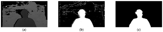 (a) Input depth image, (b) after thresholding, and (c) after morphology.