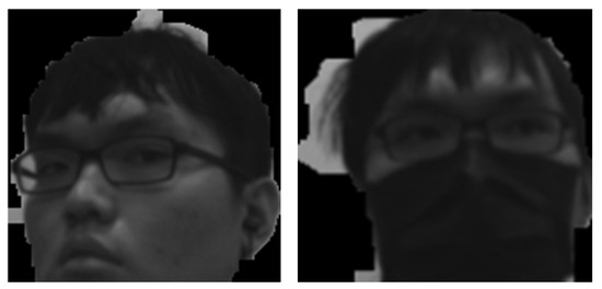 When the mask was not worn and the face was not lifted, there were “thick” edges at the bottom part of the image due to the fact that mouth and nose were there. When the mask was not worn and the head was lifted, there were no edges at the bottommost region, but several edges of the mouth or nose were visible below the half of the image. When the mask was worn and the head was not rotated, a horizontal edge was found across the face, which was caused by the border between the mask and the face. The number of edges on the lower part was significantly less than that on the upper part. When the mask was worn and the head was turned, a thin edge on the border between the mask and the cheeks was visible. When the mask was worn and the head was lifted, no visible edges except for side regions were observed. Thick edges of the mouth were observed in the x direction. In comparison, the vertical edge of the mask and the cheek was thinner. We excluded the thin edges by simply opening the image with a kernel with one row.