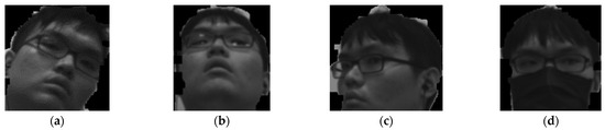 The face image was rotated to determine whether the mask was on or not. By changing either state, the detection process was conducted. If the head is tilted, a pair of eyeballs do not lie in the same horizontal position. Therefore, it is necessary to check the state of the face before detecting the eyeballs. Then, we represented each type of state as state variables. The name and brief introduction of state variables are listed in Table 2. The variables pitch, roll, and yaw are represented in “char”, and the variable mask is presented as “bool”. Figure 6 shows the examples of four head states.