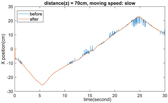 When a coordinate was an oscillation, we corrected it by finding the linear regression [4] of the last nine samples behind it and then corrected the value of the coordinate by treating it as the tenth samples. Then, the value was predicted using the linear regression model. The result after correction is shown as the orange curve in Figure 9, where the blue curve is the x-curve in Figure 10.
