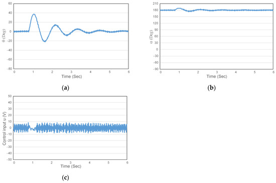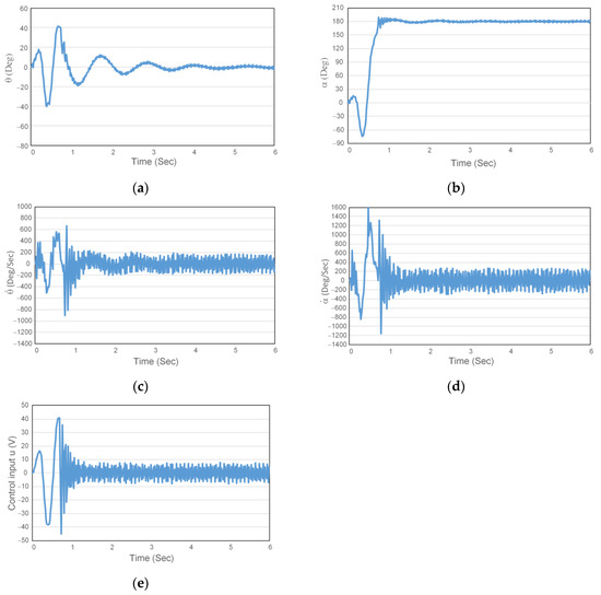 Figure 3 shows the angular displacement of the rotating arm (angle), the angular displacement of the swinging arm, the angular velocity of the rotating arm, the angular velocity of the swinging arm, and the control input of the rotating arm to time. The rotating arm θ moves left and right in the beginning from the start point to 17.5°, then in the opposite direction to −40°, and then moves significantly to a position of 41° (Figure 3a). This demonstrates the swing action that forces the swing rod to swing up. At this time, the swing rod α in Figure 3b moves as the rotating arm θ moves. A greater swing amplitude is obtained until it switches to equilibrium and then remains at a position 180° to the equilibrium point. Figure 3c and d, respectively, show the angular velocity of the rotating arm and the angular velocity of the swing rod. In this experiment, the angular velocity of the rotating arm reaches a maximum of 900 (angle/second) and stabilizes within 200 (angle/second). The angular velocity of the swing rod reaches a maximum of 1599 (angle/second) and then stabilizes within 250 (angle/second). The control input u reaches a maximum of −45 (V) when input to the rotating arm motor and oscillates within a 10 (V) range after stabilization, as shown in Figure 3e.