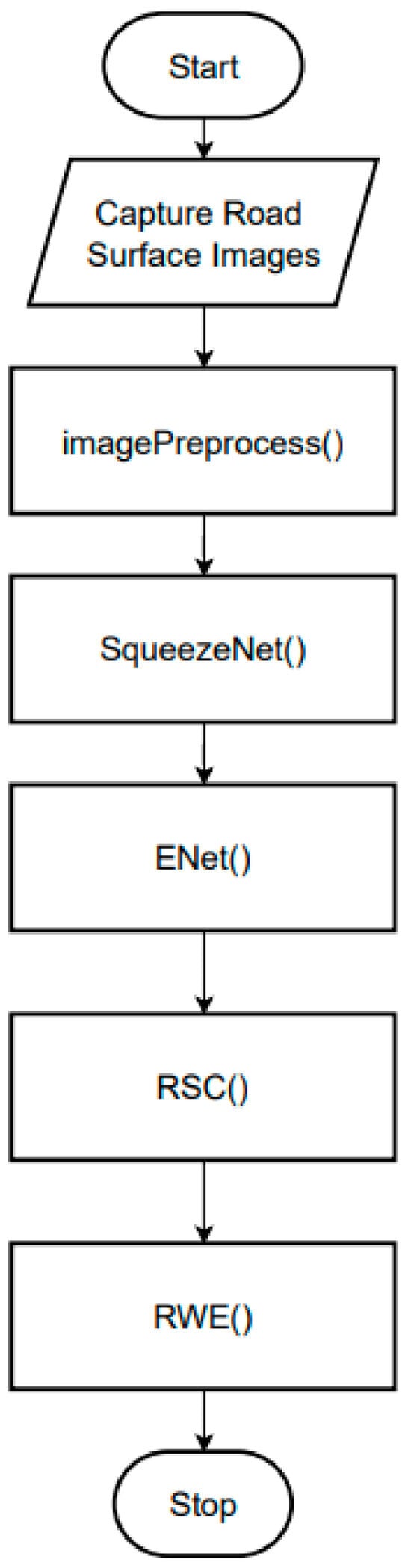 Figure 3 shows the software development process of the system. The process consisted of five modules: imagePreprocess(), SqueezeNet(), ENet(), road surface classification RSC(), and road wetness estimation RWE(). Each module included important features for identifying the type of road surface and determining wetness. The captured images were stored in the SD card to compose the database of the system. The images were resized into a fixed input state. The SqueezeNet model normalized the pixel value of the image to 1 to maintain the consistency of the images. The normalized images were classified by the SqueezeNet model to determine wetness. The extracted features were fed into ENet for semantic segmentation. The ENet model generated segmentation maps at the pixel level to effectively distinguish the road from the surrounding background. The deep learning models were trained to classify road surfaces and estimate road wetness. Residual shuffle convolution (RSC) and real-world evidence (RWE) processed classified images. The images were then categorized.