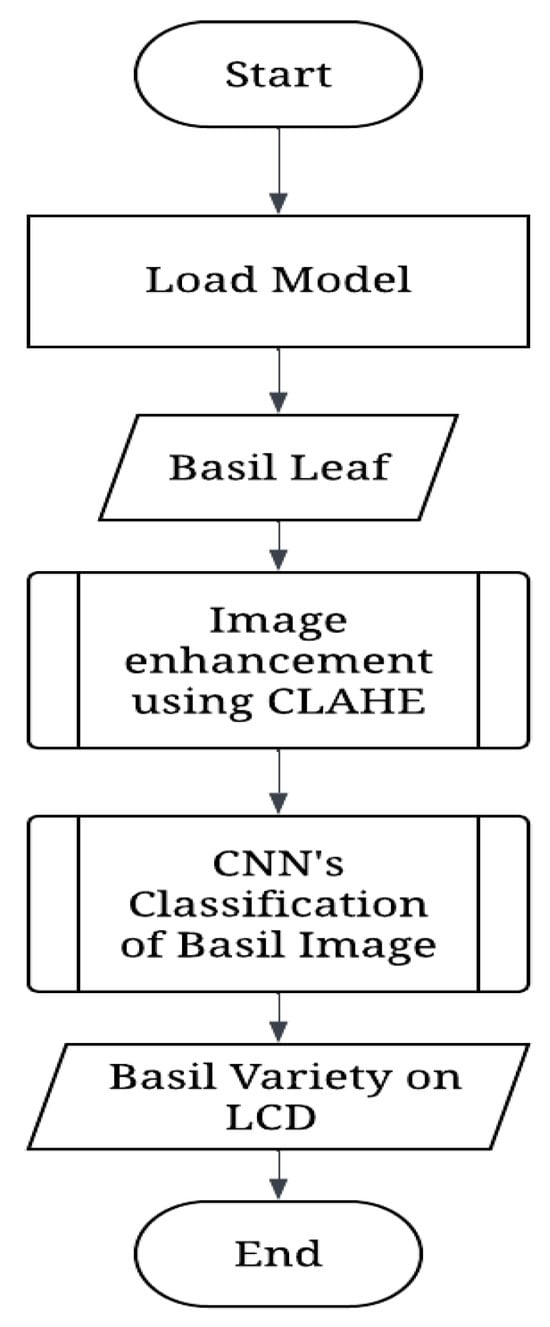 Figure 3 displays the system operation flow chart. The model was loaded into the system; then, the Raspberry Pi 4 camera module captured basil leaf images. Next, the CLAHE module enhanced the image. After enhancing the image, the CNN module extracted features to classify the input image. Finally, the output was displayed on the LCD.