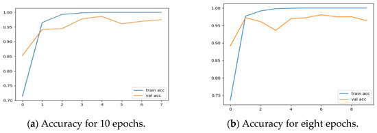 The training performance of the model is depicted in Figure 8. The model improved its accuracy over time. Two models with different epochs were tested to determine the better model. For 10 epochs, the accuracy was 97% while for eight epochs, the accuracy was 96%.