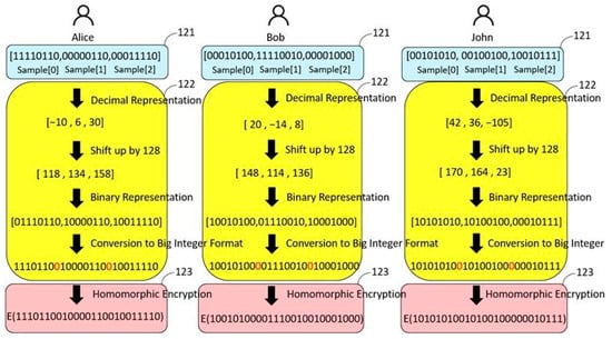Each of Alice’s three samples is adjusted using the sample value shifting method. Specifically, 128 is added to each sample (since ), ensuring that the sample values fall within the range of 0 to 255. After the adjustment, Alice’s three samples become 118, 134, and 158.