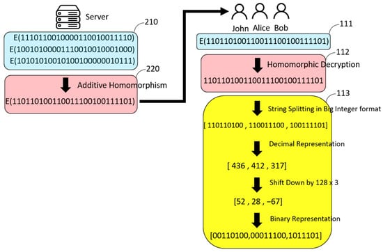 This big integer is then encrypted using homomorphic encryption, generating the ciphertext E(1110110010000110010011110).
