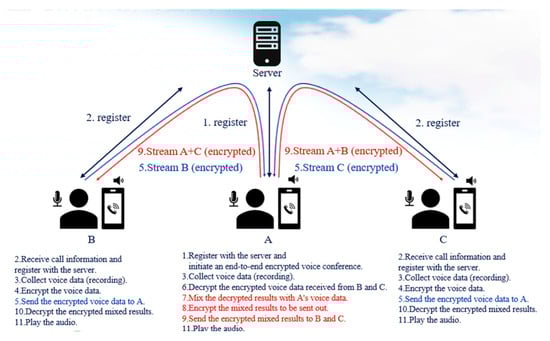 The homomorphic encryption method requires encrypting the original voice data to transmit the ciphertext to the server using homomorphic addition to directly mix the encrypted voice data on the server. The mixed result is then sent back to each mobile terminal for decryption and playback. Although this algorithm mixes encrypted voice data without a need to decrypt these on the server, it necessitates the transmission of the original voice data, which imposes a heavy burden on the mobile CPU and requires significant time for encryption and decryption. Additionally, the large amount of data processing reduces the audio sampling rate. During a meeting, all terminals must re-exchange keys to add a new member, which disrupts the meeting. In contrast, end-to-end encryption technology combined with terminal-side mixing technology allows the mobile terminal to encode the voice data to reduce its size before mixing and encrypting the encoded voice data. The ciphertext is then transmitted to the server, which forwards it to each mobile terminal for decryption and playback (