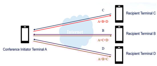 6]. The encoded voice data are encrypted using the keys obtained during the key exchange stage, transmitted via user datagram protocol/real-time transport protocol (UDP/RTP) packets, and forwarded by the server to the conference-initiating terminal for decryption and mixing. The conference-initiating terminal then re-encrypts the mixed voice data according to each terminal’s encryption key and forwards these to each terminal via the server for decryption and playback. The conference-initiating terminal thus takes over the mixing task from the server, which is then only responsible for forwarding the voice data, achieving a truly end-to-end encrypted conference.