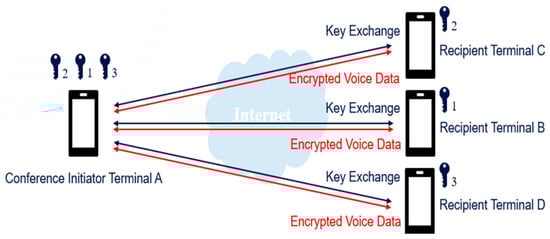 Since each mobile terminal and the conference-initiating terminal have different keys (