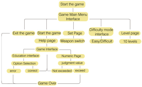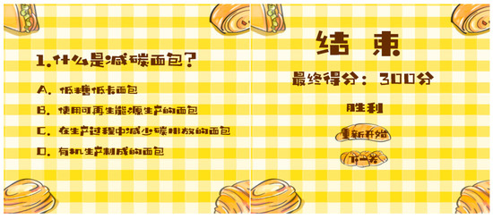 The main menu interface introduces the game content, named “Bread Elimination”, featuring the basic user interface with options to start and exit and to configure the settings. On the settings page, the weapon switch (rolling pin and mixer) and music, font selection, speed adjustments, and other functions are introduced. Easy or difficult modes can be selected, with the latter featuring faster speed and quicker obstacle settings compared with the former, presenting an overall higher difficulty level. The guiding interface assists players in their game experience, guiding operation methods, level settings, and game explanations. The main element of the game is bread (black bread and white bread). Players score points by using a mixer or rolling pin to strike the bread on an educational interface, gaining five carbon footprint points for hitting black bread and losing five carbon footprint points for hitting white bread. Correct answers allow players to continue, while incorrect ones end the game. The maximum total score is 300 points, with over 40 points required to advance to the next level. The score is calculated after the game is over, providing basic criteria to restart the game or to proceed to the next level. The score is then ranked, rewarding the high-performing players.