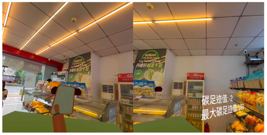 In the game scene design, program levels are set by creating scenes and using the game manager (Script) to establish the opening levels. The game’s interaction mode employs ray interaction, allowing players to enter levels by clicking with their controllers. Players can earn carbon footprint points by striking the bread (Figure 8 and Figure 9). Educational prompts appear during gameplay to ask the players questions. Correct answers and certain points allow users to progress (Figure 10).