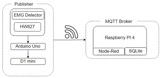 Figure 1 shows the developed system with the message queuing telemetry transport (MQTT) protocol [10] for real-time data transmission. Arduino serves as the Publisher, and sensor data from EMG and HW827 is delivered on the Raspberry Pi 4 [11] via D1 mini ESP-8266, sourced from WEMOS Technology Co., Ltd., Shenzhen, China. The Node-RED [12] acts as the subscriber, where the data from EMG and HW827 sensors are displayed on the Node-RED Dashboard UI and stored in the SQLite database across the Raspberry Pi 4, sourced from Sony UK Technology Centre, Pencoed, UK.