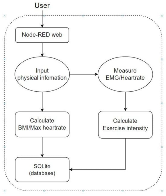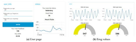 A subject can input age, height, and weight on our system (Figure 2a). The subject’s body mass index (BMI) is displayed on the system. The maximum HR is calculated by subtracting the subject’s age from 220 [9]. The real-time HR in one minute is illustrated on a line chart. Figure 2b presents EMG data in line and gauge charts. The line chart displays data in one minute, and the gauge chart shows the latest EMG value. These values are updated every two seconds on the Node-Red platform, and they are stored in the SQLite database through Raspberry Pi 4. The flow of the proposed system is shown in Figure 3.