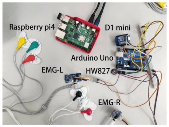 The hardware devices used in the system include two Grove-EMG Detector, sourced from Seeed Studio Co., Ltd., Shenzhen, China, noted as EMG-left and EMG-right, and a HW827 sensor, sourced from Shenzhen Yike Technology Co., Ltd., Shenzhen, China. These sensors are activated using the Arduino UNO controller, sourced from Arduino S.r.l., Scarmagno, Italy. All sensor data are transmitted to the Node-Red dashboard and SQLite database through the D1 mini Wi-Fi module (ESP-8266), sourced from WEMOS Technology Co., Ltd., Shenzhen, China, as shown in Figure 4.