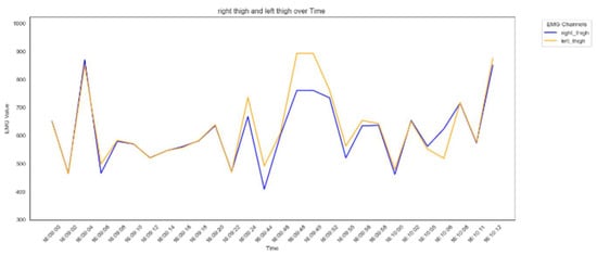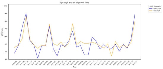 Both subjects had normal BMI and achieved a “Moderate” exercise intensity level, indicating that the exercise intensity in the experiment was a general physical activity. The EMG data from the testing period showed that the non-dominant leg had higher EMG than the dominant leg. The average EMG of the male subject was 604 μV for the right leg and 617 μV for the left leg, indicating that the non-dominant left leg’s EMG was higher than the dominant right leg. For the female subject, the average EMG was 516 μV for the right leg and 529 μV for the left leg (Figure 5). The average EMG data of the female subject’s non-dominant left leg was also higher than that of her dominant right leg (Figure 6). This indicates that the non-dominant leg has more muscle load during exercise, thereby reflecting muscle asymmetry and potentially increasing the risk of injury.