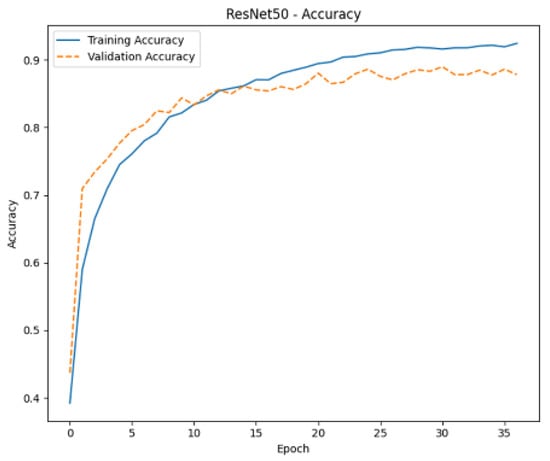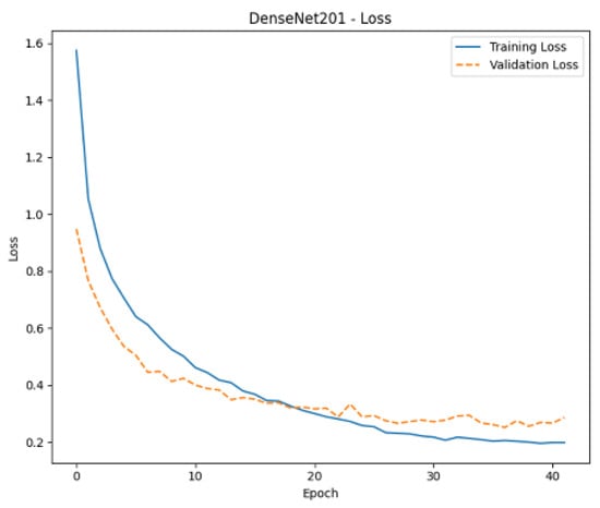 We compared the accuracy and performance of different models. Using diagrams and tables, the training effectiveness of each model was visualized. The accuracy of ResNet50 is presented in Figure 3, while Figure 4 illustrates the loss of DenseNet201.