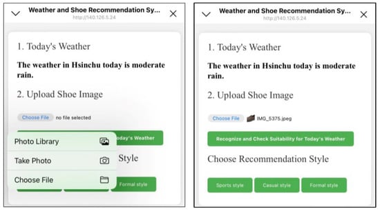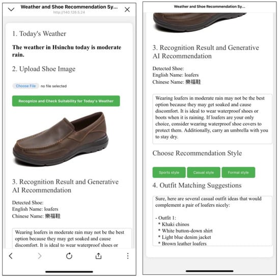 After recognition, generative AI generates personalized shoe recommendations based on weather and location, while also providing AI-generated explanations and visuals to support each suggestion (Figure 6). The user experience is enhanced by offering practical, tailored recommendations along with clear reasons and images for each choice. For example, if the weather is rainy, the system might suggest waterproof or durable shoes, while sunny conditions could prompt recommendations for lighter, breathable footwear. By considering the user’s geographic location, the AI tailors suggestions to fit regional styles or preferences, offering both personalized and practical recommendations in suited to the user’s environment.