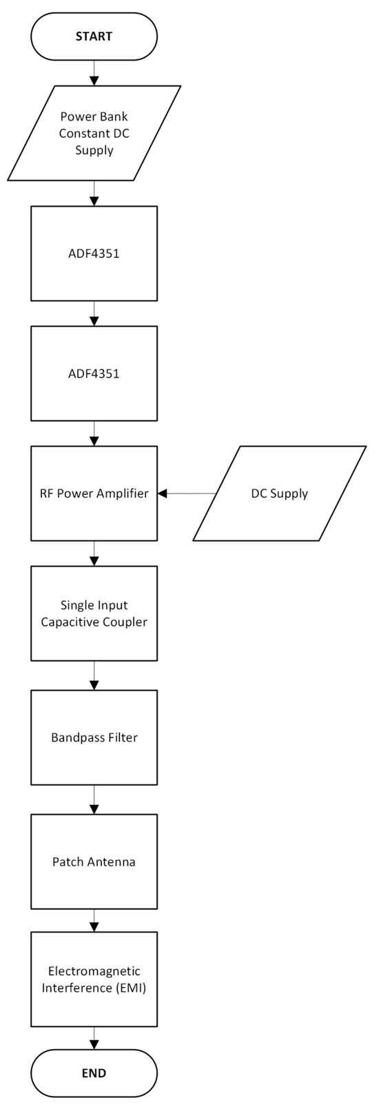 Figure 1 shows the operation of the connected circuits and devices from the signal generator to the patch antenna as the signal’s destination. It begins with powering the signal generator to produce the frequencies required for interference. The process uses the incoming signal to be amplified by a 20 dB power amplifier linked to the next circuit. The bandpass filter was a ceramic capacitor in series. The interfering signal is radiated directly from the output of the filter to the input of the patch antennas. The DC-biased circuits are used in the amplifier, and the ADF 4351 with DC batteries is used to turn the circuit on. The framework and the flowchart do not differ from each other since their straightforward operation is the same process and is simple without complexity.