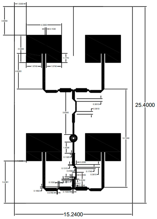 Dimensions, cuts, and traces were determined before connecting to the inset feed of the antennas. The slanted cuts on the trace were avoided due to the signal reflections and radiation to the edges. The small traces were designed to avoid radiation on the edges and pushing the signal due to restriction to larger areas of the traces to the main antennas. The large traces were used to draw more power and signals from the feed point. The outer dimensions of the copper board were 15.24 cm (about 6 in) and 25.4 cm (about 10 in) (Figure 2).