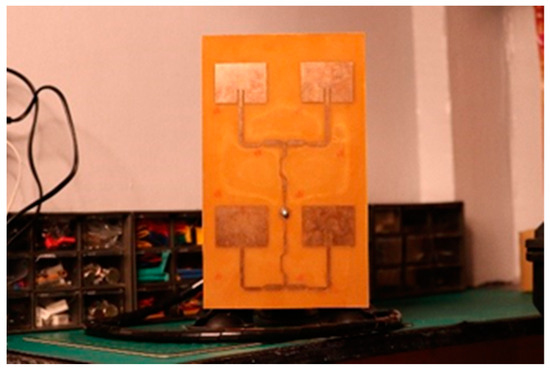 The 2D model from AutoCAD was printed with the same size as the dimensions of the copper board. However, there were manufacturing errors in the PCB board when actual measurements were performed using a caliper. To create parchment that adhered only to the face of the board, the paper was soaked in oil. Then, it was exposed to high-intensity light for 30 min. Afterward, it was washed using a developer solution and etched. The green paint on the antenna and ground plane was removed by using pure acetone. Fabricated on a double-layered photosensitive FR-4 copper board, the male N-type connector probe was soldered on the copper tracing in the front view 2 × 2 patch antennas. The antenna was attached to a modified camera mount, and an RG-142 coaxial cable was used. It radiated frequencies effectively, as observed on the wireless spectrum analyzer, wherein the waveforms were detected with a high amount of power from the range of 35–960 MHz (Figure 4).