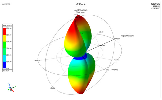 For the sampling frequency of 35 MHz in determining the polarization of the antenna designed, the phase of the electric field was detected from the left and right directions of the antenna with a magnitude of the radiation at 5.4. The state of polarization and orientation in this sample frequency, referred to as the phase in “Phi”, is observed and simulated in a 3D polar plot (Figure 5).