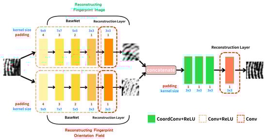 Figure 2, the architecture consists of two independent BaseNets for restoring the fingerprint image and reconstructing the orientation field. It captures ridge directions critical for fingerprint detail preservation. After the initial feature extraction from the input fingerprint, the outputs from BaseNets are combined with a SIFT feature map. This integration enhances the model’s ability to retain key fingerprint details. Outputs are combined to pass through three convolutional layers, each of which includes the SIFT feature map to effectively form the CoordConv layer. In these layers, the convolution operation is augmented by coordinate information from the SIFT feature map for the model to better capture spatial relationships and fine details within the fingerprint image.