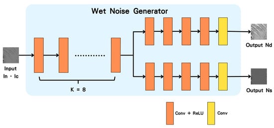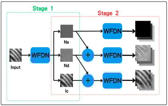 Figure 1 shows the complete architecture of the WFDN block. The WFDN block processes a single wet fingerprint image as input and generates three outputs: the restored fingerprint image, fingerprint-related noise, and fingerprint-unrelated noise. To derive the noise images, the input fingerprint image is compared with the restored image by subtracting the restored image from the input. This process is conducted to effectively isolate the noise and classify it into fingerprint-related and unrelated noise. This method ensures the effective separation and management of different noise types, maximizing image clarity and improving recognition accuracy. These three outputs provide higher-quality restored images and enable better noise characterization for optimization in later stages.