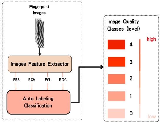 Figure 5, including the image feature extraction process and the auto label classification module. This method accurately evaluates the quality of wet fingerprints and provides crucial information for subsequent fingerprint restoration. The system consists of the feature extractor and the auto label classification module. The feature extractor is used to extract vital metrics from the raw fingerprint images, which are essential for quality assessment and further processed by the auto label classification module.