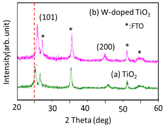 All diffraction peaks corresponding to the TiO2 anatase structure with a tetragonal central structure and (101) preferred orientation are shown in Figure 1. Compared with the pure TiO2 film, the diffraction peak intensity of the tungsten (W)-doped TiO2 film on the (101) plane was significantly enhanced, which indicated that W doping enhanced the order of the crystal. Furthermore, the (101) peak position of the W-doped film shifted toward higher 2θ values, indicating a slight shrinkage of the unit cell due to the partial replacement of Ti ions by W ions or the occupation of interstitial positions in the TiO2 crystal. Since the ionic radii of W (0.60 Å) and Ti (0.605 Å) are close, during the doping process, W ions replace Ti ions in the crystal lattice, thus achieving a stable doping structure [28,29].