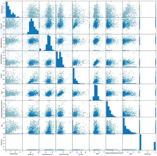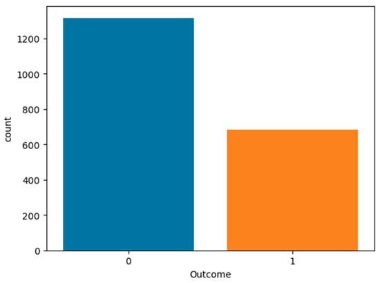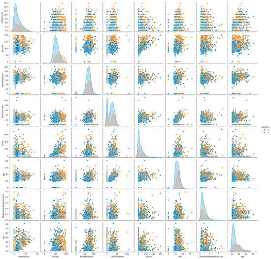 The dataset used in this study comprised 768 records, each containing nine attributes, with one attribute designated as the outcome. A total of 268 cases were classified as “tested positive,” indicating diabetes, while 500 cases were labeled as “tested negative,” signifying the absence of diabetes. Variables encompassed the number of pregnancies, blood pressure, glucose levels, skin thickness, insulin levels, body mass index (BMI), age, and potentially any pedigree function associated with diabetes [1]. These characteristics are essential for finding trends and estimating the risk of diabetes in the dataset’s members.
