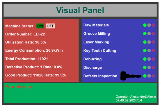 In the fully automated key production line, the visual panel of the production line is essential in realizing intelligent production management. Through IoT technology, processing information is automatically transmitted to a cloud database and displayed on visual panels at both remote and local controllers. These statuses include operator name, production part number, work order status, messages from each station (such as operating normally, waiting, or error messages), production quantity, production time, yield rate, and energy consumption. The visual panel integrates multiple key production indicators and provides an intuitive and easy-to-understand interface (Figure 2). The status of each station, including “Feeding Station”, “Groove Milling Station”, “Laser Marking Station”, “Key Tooth Cutting Station”, “Deburring Station”, “AOI Defects Inspection Station”, and “Discharge Station”, is displayed in three colors: “ON” (green), “WAITING” (yellow), and “ERROR” (red), allowing operators to quickly interpret the machine status.