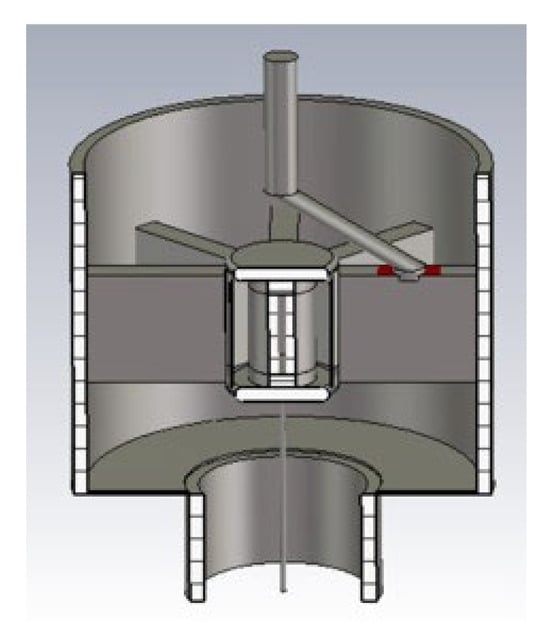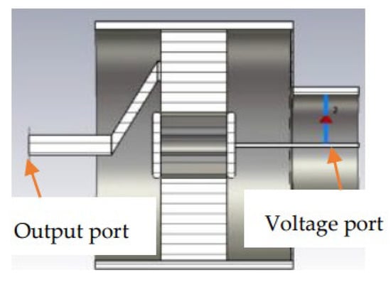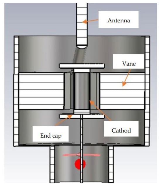 The circuit efficiency ηc was set at 85% (the typical range is 80–90%), the power was 1 kW, the total efficiency ηc was 75%, and the impedance was 11.5 kΩ, according to the total efficiency ηt []. The geometric structure used in magnetron simulation is presented in Figure 2. Table 1 shows the detailed parameters of the 193 MHz magnetron.