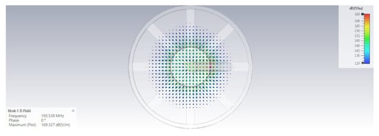 The designed magnetron was eigen-simulated. The PIC simulation took a long time, and the results were unsatisfactory. However, in the eigenmode simulation, the magnetron was used for about 5 min. The resonant frequency of the tube was controlled, and a voltage and a magnetic field were applied in the PIC simulation to measure the output power, voltage, and resonant frequency. In the eigenmode simulation, the boundary condition was set to Et = 0, and a tetrahedral mesh was used to improve accuracy. Figure 3 shows the results of the eigensimulation.