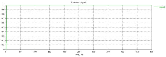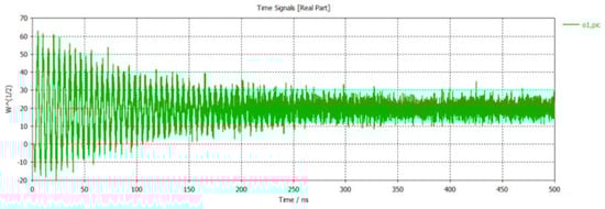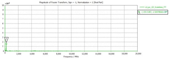 To determine the output power and voltage, a complex PIC simulation was required. The input voltage of 30 kV was applied to the cathode input column, and the magnetic field along the Z-direction was 0.18 T. The total simulation time was 500 ns, and the grid count was 154,440. Particle emission mode requires a microwave oven magnetron with explosive emission. The rise time was 1 ns, particle kinetic energy was 3 keV, and 2974 particles were emitted. The CPU was accelerated in the PIC simulation to reduce the simulation time. Accelerated simulation with six CPUs took about three hours. In Figure 4, discrete voltage levels were fed into the system, and a waveguide port was set at the output to capture the output signal. A Fourier transform was then performed to convert the signal into a spectrum diagram. In Figure 5, the signal rise time for the fed voltage is 1 ns, and the total time is 500 ns. With the above parameters, the frequency and output power values under the influence of the voltage and magnetic field are determined. Figure 6 shows the output frequency results after Fourier transformation. Figure 7 shows the measured output power at 193 MHz, with an initial power of approximately 1.2 kW and a steady-state power of approximately 400 W.