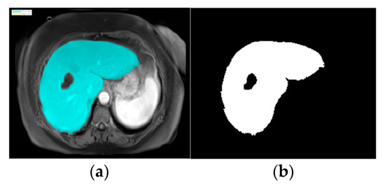 Images of parts of liver and tumors in liver: (a) ROI masking and (b) liver structure in binary code.