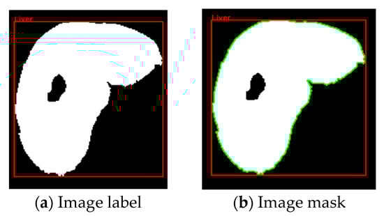 After the liver image was converted into a binary image, we used a technique to help the doctor conveniently determine the structure of the liver during the medical examination, allowing for a more specific analysis of tumor detection [9]. In the data presented, we selected information from a patient with a large tumor. In image segmentation, the image was automatically labeled and masked to obtain information on the labeled object in the binary image shown in Figure 5. In the labeling and contouring process, several objects were removed, and the pixel threshold was adjusted. The information of the labeled object was determined based on the boundaries in the label, utilizing metrics such as bounding box, area, and perimeter. Identifying and locating the structure of the liver enabled accurate tumor detection in the liver using binary images.