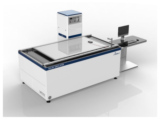 The solar simulator used in this study was designed to cover a spectral wavelength range from 380 to 1100 nm for all flat-panel photovoltaic modules. This simulator enables the accurate measurement of module power output even in the absence of standard reference modules, making it ideal for testing or quality control for manufacturers. The AAA-grade steady-state solar simulator ensures high performance with an A-grade classification in spectral match, irradiance uniformity, and temporal stability. By using a xenon lamp array as the light source, the simulator’s unique optical design ensures uniformity within 2% without requiring frequent adjustments. Each lamp unit maintains stable uniformity and spectral characteristics, enabling rapid testing by selectively activating or shielding individual lamps without compromising spectral match or uniformity. This simulator provides the most accurate artificial light source that mimics outdoor sunlight conditions. In this research, the solar modules were tested using the 3A-grade steady-state solar simulator (Figure 3). The 3A classification refers to the simulator’s performance: A-grade spectral match with the solar spectrum, A-grade uniformity, and A-grade temporal stability. The experiments were conducted under specific irradiance and temperature conditions to evaluate the performance of the modules.
