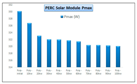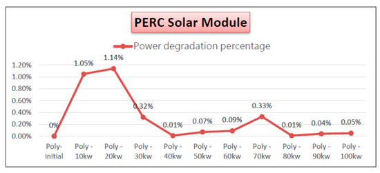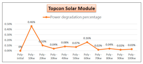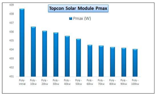 The maximum power (Pmax) of solar modules was calculated after 100 kWh/m2 of irradiance based on the standard formula for testing the maximum power efficiency of solar panels: Imp (current at maximum power) × Vmp (voltage at maximum power) = Pmax (maximum power) [12]. The initial Pmax of the PERC solar module was 330.19 W, and after exposure to 100 kWh/m2 of irradiance, it decreased to 320.13 W, indicating a power degradation of 3.14% (Table 1, Figure 6 and Figure 7). The initial Pmax of the TOPCon solar module was 438.56 W, and after the same irradiance exposure, it decreased to 434.09 W, representing 1.03% power degradation (Table 2, Figure 8 and Figure 9). The TOPCon solar module exhibited superior performance, with only a 1.03% decline in the maximum power, compared with a 3.14% decline of the PERC solar module.