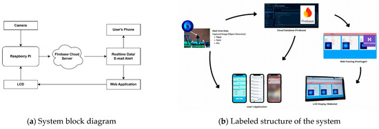 Figure 1 provides an overview of the system architecture and components of the IoT-based water monitoring system. The Raspberry Pi (RPI) serves as the main processing unit, handling data from the camera’s images. The raw data are sent to the RPI and stored in the cloud via Firebase version 11.0.2, enabling continuous and precise monitoring. The system alerts both the application and web hosting service if anomalies in the water quality are detected.