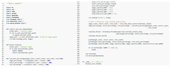 A program based on Python version 3.9.13 integrates the detection process of real-time monitoring and analysis to assess tap water quality and identify leaks. It processes video data from the camera and detects objects using libraries such as “cv2”. Key functions include image capture, storage management, and any findings of the particular contaminants, namely, algae, ants, and sand. The primary function, “display_live_video”, captures video, analyzes frames, and employs the pre-trained YOLOv8 model to classify contaminants in real time, adjusting to different times of the day (Figure 2).