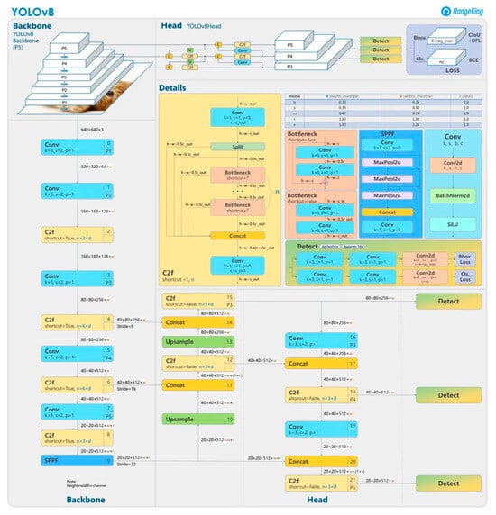 Overview of the YOLOv8 network structure. Adapted from Solawetz and Pochetti [9], with reference to a visualization by GitHub user RangeKing.