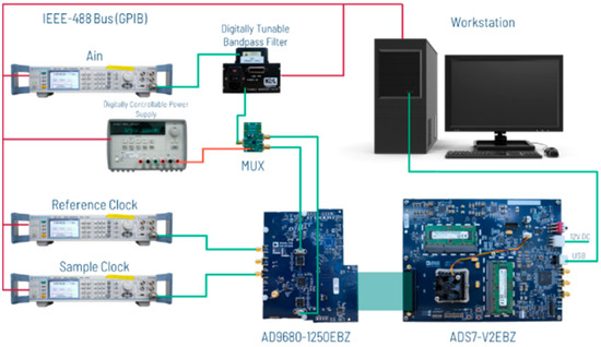 The setup for the proposed method (Figure 2) is similar to the existing one. The proposed setup adds the integration of the IEEE-488 Bus (GPIB). With this control, the centralized management of the equipment in the setup enables us to alter the power levels and frequencies of the signal generators. The signal generators are used as clock sources and analog input signal sources. The digitally tunable bandpass filter allows the setup of a one-size-fits-all solution as this changes the resonant frequency at the same time that the input frequency is changed according to the test procedure without the need to manually replace the connected bandpass filter. The multiplexer makes the entire automation possible and eliminates the need to manually reconnect the SubMiniature version A (SMA) cables from one channel to another. AD9680-1250EBZ is the perfect device to demonstrate this kind of feature.