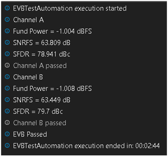 At the end of the testing, data are obtained by taking a screenshot of the evaluation software output and deciding if that channel has passed both the SNRFS and SFDR limits. These steps are conducted in the Capture FFT B block. The only noticeable difference is the Set Switch to Channel B sub-block, which reconfigures the multiplexer to switch the connection from Channel A to B. After this, the program performs a clean-up, which involves terminating all applications in the Close Application block and finally shows if the DUT has passed or failed in the Final Result block. The inherent image recognition in the program enables it to output a text (Figure 4) in UIPath alongside an Excel File, which records board measurement data and whether they have passed or failed the test criteria.