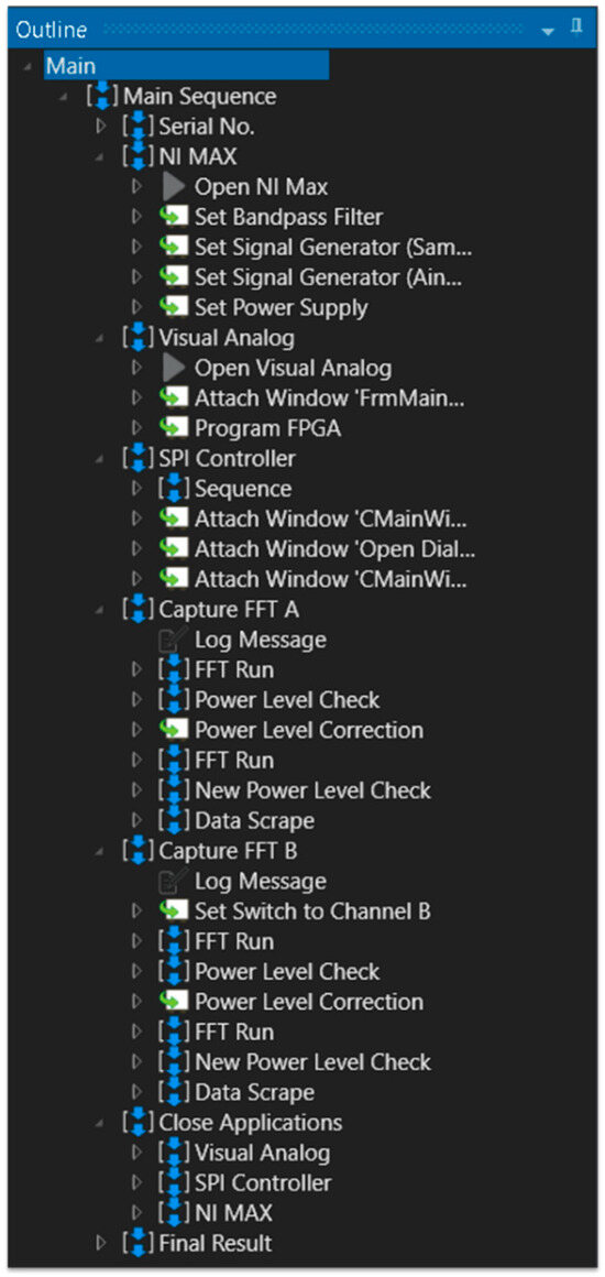 UIPath is used as an application to program for the RPA. The code is created with a flow, recording mouse clicks and keyboard presses while executing the test. Figure 3 shows the code outline developed in conjunction with this study. The code sequence starts with the user inputting the Serial No of the board being tested. The NI Max block involves the control of the test equipment, such as setting the frequency of the bandpass filter, powering up the multiplexer, and configuring the parameters for the sample clock and the reference clock. Meanwhile, the Visual Analog and SPI Controller blocks deal with the initialization and operation of the test software. The SPI Controller ensures that there is proper communication from the FPGA to the DUT. From there onwards, the code moves on to the Capture FFT A block. This block first checks the power level measured by the test software. With image recognition, the measurements from the Visual Analog are sent back to UIPath. For example, when the fundamental power is not met, UIPath then initiates equipment control using NI Max and adjusts the signal generator’s power accordingly.