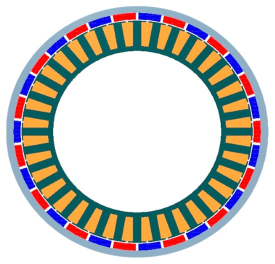 - Cao, Z.; Liu, J. Cogging Torque Reduction for Outer Rotor Interior Permanent Magnet Synchronous Motor. In Proceedings of the IECON 2020—The 46th Annual Conference of the IEEE Industrial Electronics Society, Singapore, 18–21 October 2020; pp. 2689–2693. [Google Scholar]
