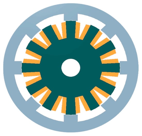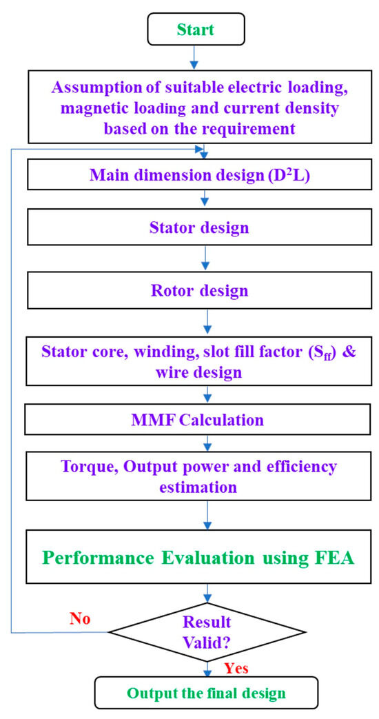 The structures of PMSMs and SRMs are shown in Figure 2 and Figure 3, respectively. The detailed design procedure is elaborated in Figure 4. The design process begins with the selection of suitable electric loading, magnetic loading, and current density based on specific application requirements. Following this, the primary main dimension design, D and L, is determined. Successive steps involve considerations for the stator core, winding, slot fill factor, and wire design. The magneto-motive force (MMF) is then calculated. The design is validated using finite element analysis (FEA). The performance parameters of torque, output power, and efficiency are evaluated. Based on these parameters, the design is either validated or refined until the performance parameters satisfy the application requirements.