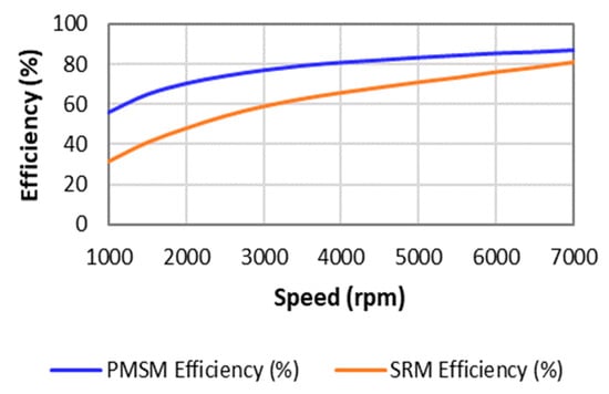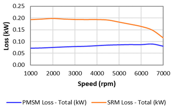 At the rated speed, the loss value of the PMSM is much lower in contrast to the SRM motor. The same illustration is depicted in Figure 7.