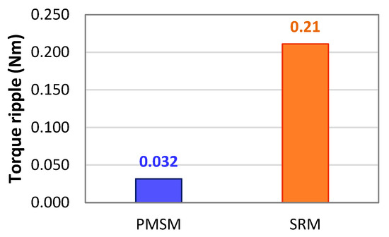 The torque ripple in the PMSM is less in comparison with the SRM, as depicted in Figure 9.